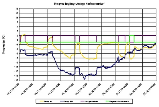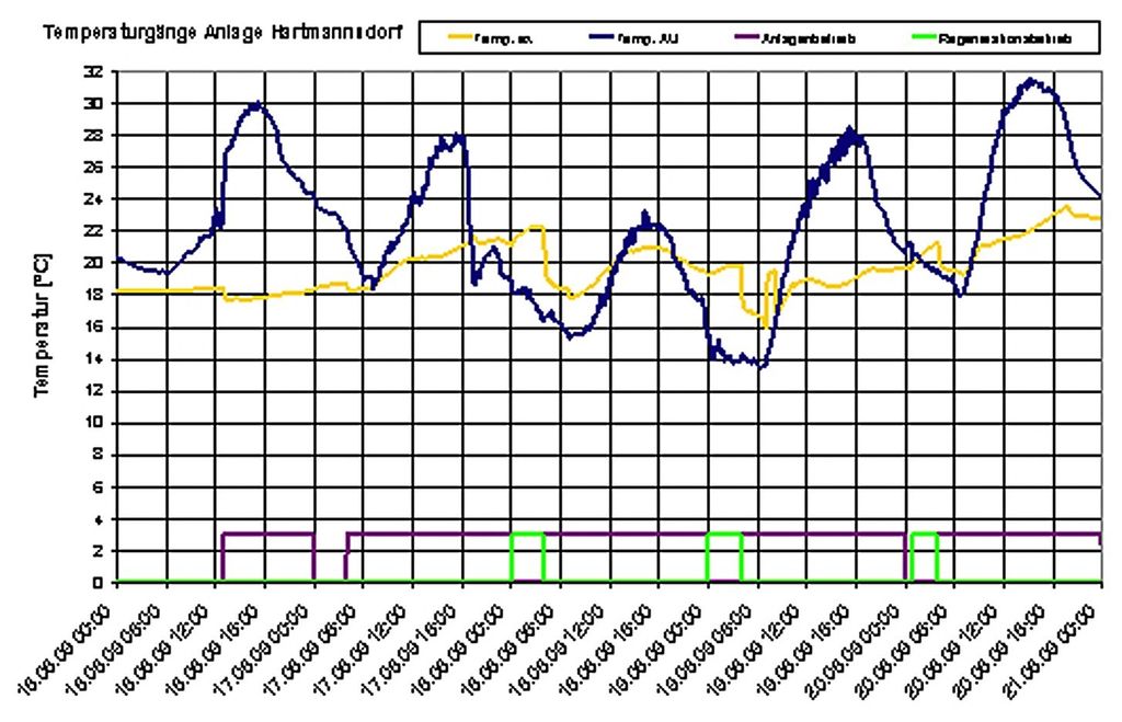 - Tagestemperaturgang der Lufteintrittstemperatur in den Schotterspeicher,