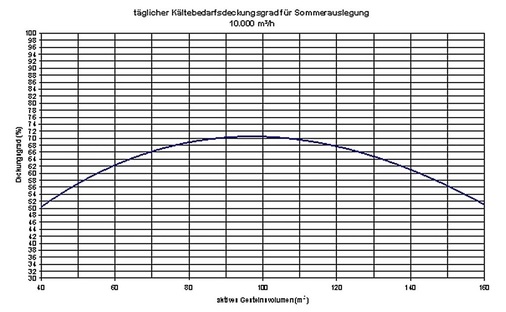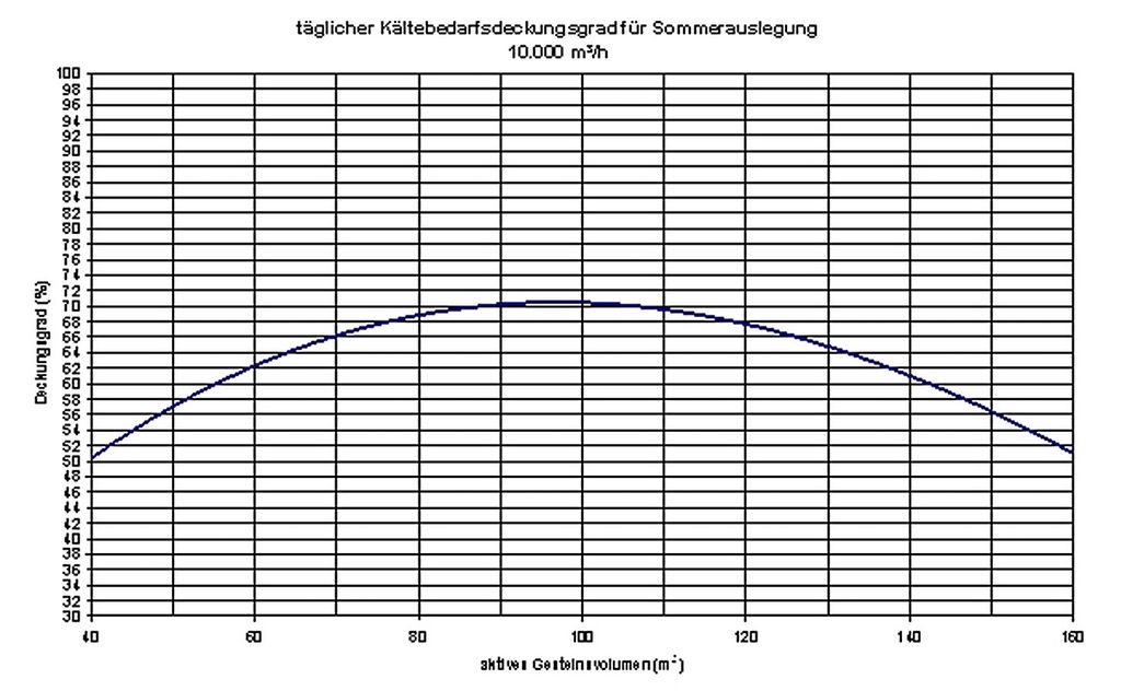 Beim maximal erreichbaren Deckungsgrad besitzt der Speicher seinen optimalen Größenbereich hinsichtlich der energetischen Effizienz. In einem zweiten Diagramm wurde der Tagesdeckungsgrad für die verschiedenen Anlagenvolumina unter Auslegungsbedingung aufgeführt. Für derzeitige Anwendungen stehen Diagramme mit Luftvolumenströmen zwischen 5000 und 50000 m³/h zur Verfügung.