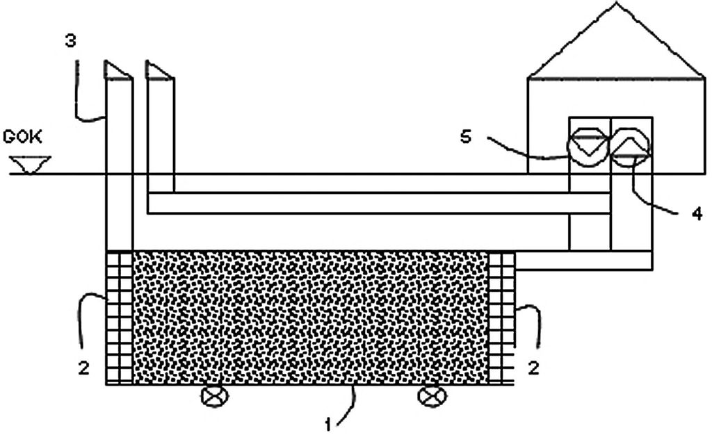 Der Schotterspeicher (1) in Bild 2 besitzt eine quaderförmige Geometrie. Seine Größe ist abhängig vom Auslegungsvolumenstrom und der geforderten Speicherladedauer. Er befindet sich regelmäßig unter der Geländeoberkante (GOK). Dabei ist darauf zu achten, dass das gesamte Speichervolumen oberhalb des höchsten zu erwartenden Grundwasserspiegels liegt. Der unterirdische Ausbau kann unter freiem Gelände aber auch unter Gebäuden mit thermischer Entkopplung erfolgen.