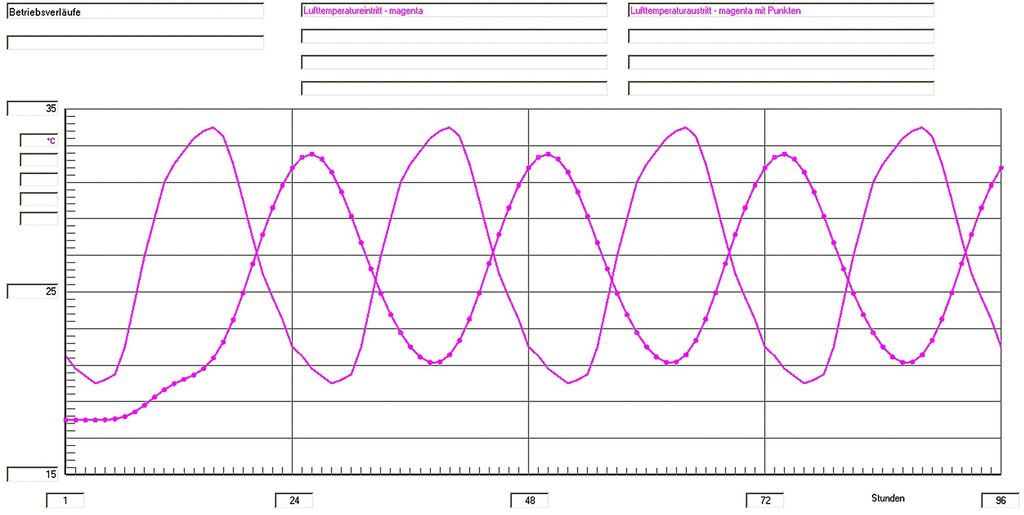 Der zur Simulation definierte Tagestemperaturgang wurde dabei vier Tage in Folge simuliert. Die Ergebnisse der Betriebsstunden 72 bis 96 wurden dann zur Auswertung herangezogen. Damit ist sichergestellt, dass Effekte durch das Einschwingen des Temperaturfeldes vermieden sind. Die errechneten stündlichen Luftaustrittstemperaturen sowie die entsprechenden Tagesaußenlufttemperaturen sind über der Zeit in Bild 5 grafisch dargestellt.