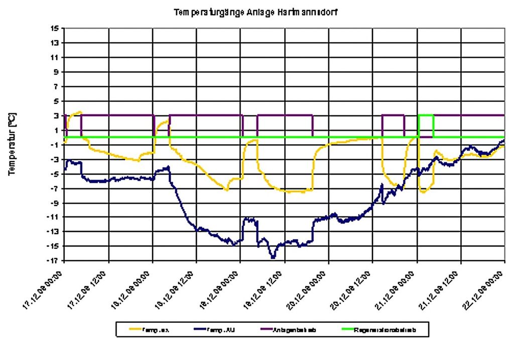 Im Winter (siehe Bild 4) erwärmt sich die kalte Nachtluft im Schotterbett bis auf das Temperaturniveau des Vortages. Anschließend wird die so vorgewärmte Luft im Klimagerät weiter auf Zulufttemperatur erwärmt und dem Raum zugeführt. Am Tag wird Außenluft über den Schotterspeicher gefahren. Dabei wird der Schotter regeneriert und auf das Temperaturniveau der Außenluft gebracht. In der Übergangsperiode ist es möglich alle vier Betriebszustände zu durchlaufen. Dies ist abhängig von der dann vorherrschenden Außentemperatur.