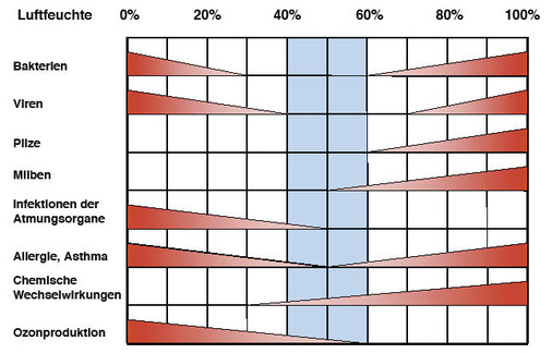 Bezüglich der einzuhaltenden Werte der Raumluftfeuchtigkeit ist die wissenschaftliche Basis etwas dünner. Allgemein werden relative Feuchtigkeiten zwischen 40 und 60% als optimal empfunden. Kurzzeitige Abweichungen auf 30% und geringer werden toleriert. Diese Erfahrungswerte decken sich mit den Bereichen der Raumluftfeuchtigkeit, bei denen biologische Organismen die geringsten Wechselwirkungen mit dem Menschen eingehen (Bild 6).