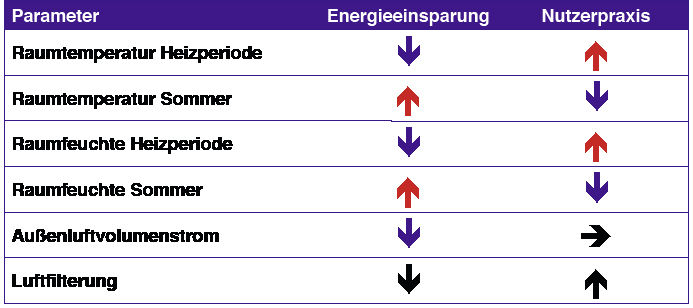 Analog verhält es sich mit den Parametern Raumluftfeuchte und Luftfilterung. Die Einhaltung von Grenzwerten an Staub und Feinstaub auch in der Raumluft (warum soll Raumluft schlechter sein als Außenluft) fordert effizientere Filtertechniken. Der unter energetischen Aspekten wesentliche Parameter ist jedoch in Mittel- und Nordeuropa der Außenluftvolumenstrom. Im Folgenden sollen diese wichtigen Parameter im Zusammenhang mit den energetischen Anforderungen etwas beleuchtet werden. Doch zunächst sollen die allgemeinen Randbedingungen diskutiert werden.