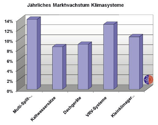 Es ist jedoch in der Politik und auch bei einzelnen Planern und Architekten eine andere Tendenz festzustellen, die Energieeinsparungen durch Verzicht auf Behaglichkeitskriterien zu erreichen. Dabei zeigt sich hier in der breiten Praxis der Nutzer ein genau gegenläufiger Trend. Aus Gründen der Energieeinsparung sollten eigentlich die Raumtemperaturen im Winter gesenkt und im Sommer höher sein, um den Aufwand für die Heizung und Kühlung zu minimieren. Tatsächlich ist jedoch die Tendenz genau umgekehrt. Die winterlichen Raumtemperaturen nehmen zu (Bild 1 und 2) und die im Sommer tolerierten Raumtemperaturen nehmen ab. Steigende Absatzzahlen von Klimasystemen in Europa belegen diese Entwicklung (Bild 3).