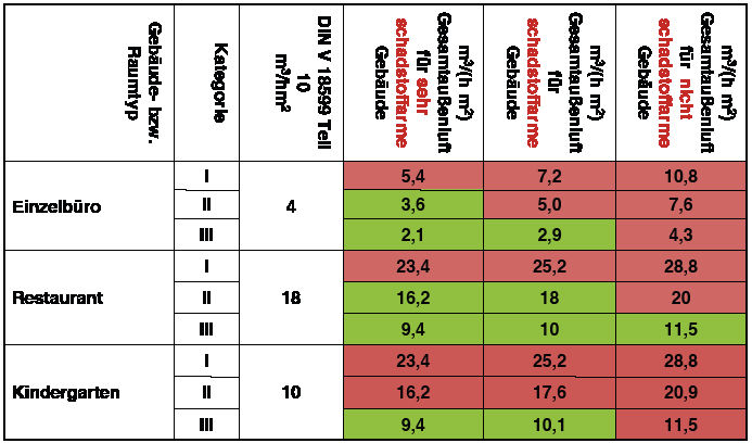 Allgemein akzeptiert ist heute die Festlegung des Außenluftvolumenstromes nach einer gebäudeabhängigen und einer personenabhängigen Komponente (DIN EN 15251, Bild 7). Für den praktischen Gebrauch in einer frühen Planungsphase ist dieser Ansatz jedoch schwer zu greifen. Deshalb hat man in der EnEV und der DIN V 18599 den Ansatz eines flächenabhängigen Mindestaußenluftstromes gewählt. Dieser Wert ist für den energetischen Nachweis im Referenzfall zu verwenden, wenn