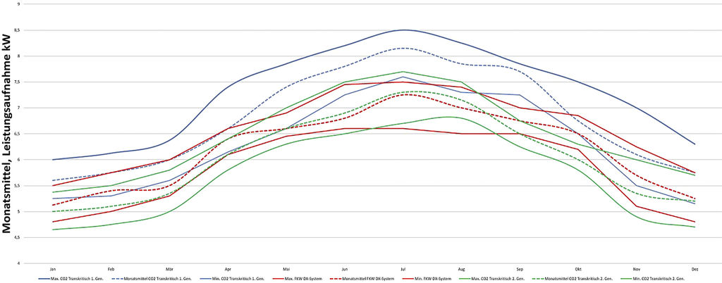 Die Anwendung von Berechnungsmodellen beruht natürlich auf einer Reihe von Annahmen, weshalb die Ergebnisse der Modelle mit größeren Unsicherheiten verbunden sind als Messungen. In Bild 1 stehende Ergebnisse/Trends wurden indessen von mehreren Feldstudien und Messungen von Anlagen bestätigt. Die Schlussfolgerung ist für alle nördlich der Alpen gelegenen Gebiete gleich und eindeutig: Bei Einsatz optimaler Komponenten, optimaler Konfiguration/Wahl der Kompressoren, Frequenzsteuerung sowie optimaler Steuerung schlagen die transkritischen CO 2 -Kühlanlagen im Energieverbrauch selbst die besten FKW-Systeme.