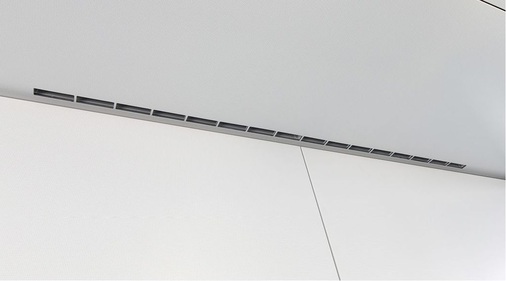 Hierfür wird die Raumluft im Deckenbereich des Think-Tanks aus dem umgebenden offenen Büro angesaugt und linear entlang der Stirnwand zugeführt. Die Abführung der Abluft erfolgt parallel ebenfalls im oberen Stirnwandbereich. Ein Kurzschluss zwischen Zuluft und Abluft wird durch die interne Luftführung und den starken Austrittsimpuls verhindert. Die Reinigung der zugeführten wie auch der abgeführten Luft findet jeweils über einen Grobstaubfilter statt. Damit das kompakte Gerät sich möglichst unauffällig in das Design der Raum-in-Raum-Systeme einfügt, ist es nahezu vollständig in deren Deckenkonstruktion integriert. Im Innern bleiben lediglich die dezenten Be- und Entlüftungsöffnungen im Deckenrandbereich sichtbar. Die Wartungs- und Revisionsarbeiten werden hingegen über die von außen gut zugängliche und einfach zu öffnende Oberseite des Lüftungsgerätes durchgeführt.