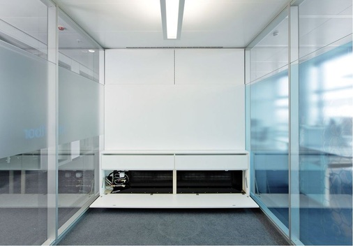 Zur Ausstattung der Think-Tanks gehört als weiterer wichtiger Baustein der im Sideboard untergebrachte Wandkonvektor emcotherm WKQ zur Kühlung der Raumluft. Dieser Konvektortyp wurde bereits in einem Multifunktionalen Trenn- und Schrankwandsystem (MTS) eingesetzt, das 2009 im Rahmen der Unternehmenskooperation zwischen Strähle und Emco Klima entwickelt wurde.