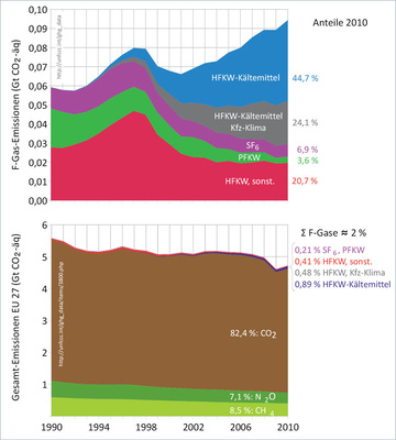 - F-Gase haben 2010 einen Anteil von ca. zwei Prozent an den Gesamtemissionen, woran die Kältemittel von Kfz-Klimaanlagen mit 0,48 Prozent und die restlichen Kältemittel mit 0,89 Prozent beteiligt sind.