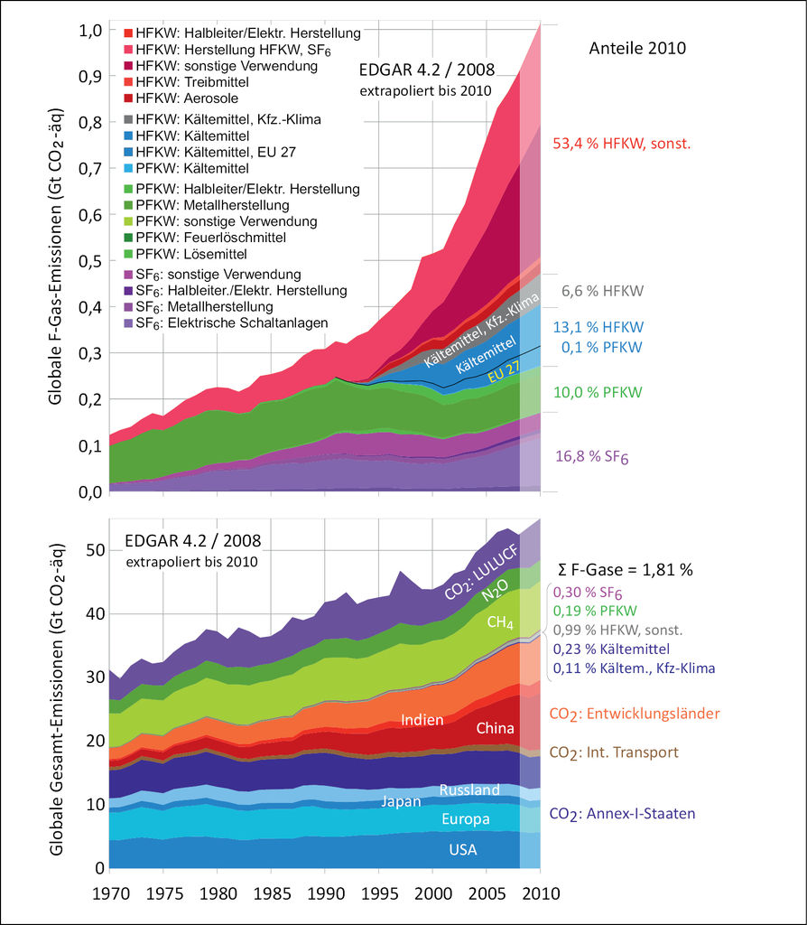 In Bild 2 (oben) sind gemäß Joint Research Centre [9] der Europäischen Kommission die globalen F-Gas-Emissionen zwischen 1970 und 2010 sowie eine Aufteilung nach zusammengefassten Anwendungsbereichen dargestellt, die in der Legende näher spezifiziert sind: