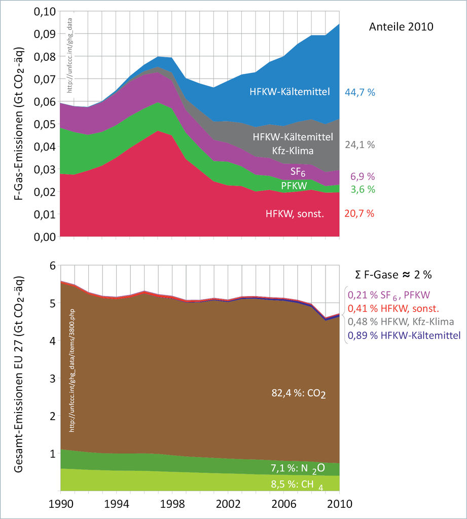 Die Emissionen aus Kältemitteln weisen 2010einen Anteil von 19,8 Prozent (6,6 + 13,1 Prozent HFKW + 0,1 Prozent PFKW) der gesamten F-Gas-Emissionen auf, die hier aufgeteilt sind zu einem Drittel auf Kfz-Klima sowie zu zwei Dritteln auf alle sonstigen Anwendungen. In der Vorbereitungsstudie zur Bewertung der F-Gase-Verordnung wird für Europa sogar von einem Anteil der Kfz-Klimatisierung von 37 bis 39 Prozent ausgegangen [10]. Der Emissionsanteil der EU 27 (Bild 3) ist durch einen schwarzen Linienzug separiert.