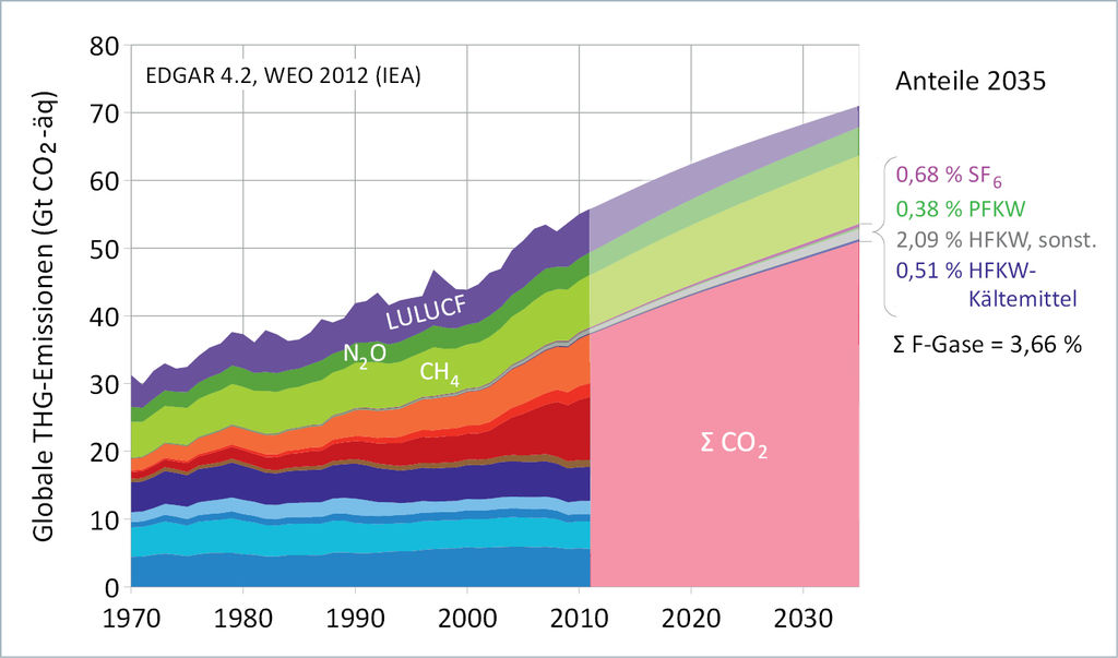 - die Emissionen von CH4 steigen um 2,5 und die von N 2 O um 0,9 Gt CO 2 -äq an (entsprechend +33 und +27 Prozent).In dem gemäß IEA wahrscheinlichsten Szenario (new policies scenario) steigen die Gesamtemissionen auf nur 58 Gt CO 2 -äq im Jahr 2035 an, die Kältemittel haben daran lediglich einen Anteil von 0,19 Prozent.