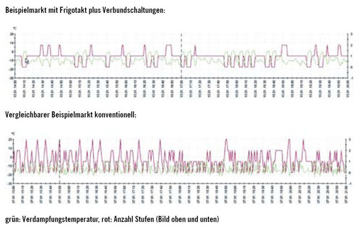 Eine Lösung für diese Situation ist das Regelverfahren Frigotakt plus von Wurm, das bereits bei mehreren Handelsketten im Einsatz ist. Dieses Verfahren ist Bestandteil des im Markt weitverbreiteten Regelsystems Frigolink. Allerdings wird das Softwaremodul vielfach nicht aktiviert und so auf die Vorteile verzichtet. Mit dem genannten Verfahren lassen sich die Kälteverbundanlage im Verbrauchsoptimum betreiben und Schwachstellen zur weiteren energetischen Optimierung aufspüren.