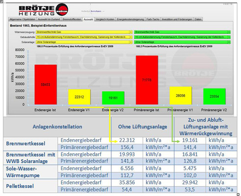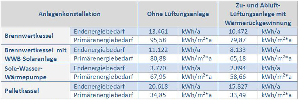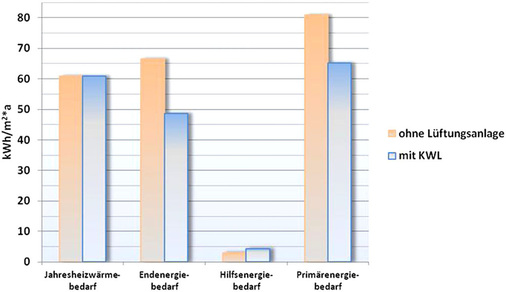 In allen Berechnungen ist der Hilfsenergiebedarf mit eingeflossen. Der höhere Strombedarf zum Antrieb der Lüftungsanlage relativiert sich uneingeschränkt mit dem wesentlich höheren Einsparpotenzial an Heizenergie durch die Wärmerückgewinnung.