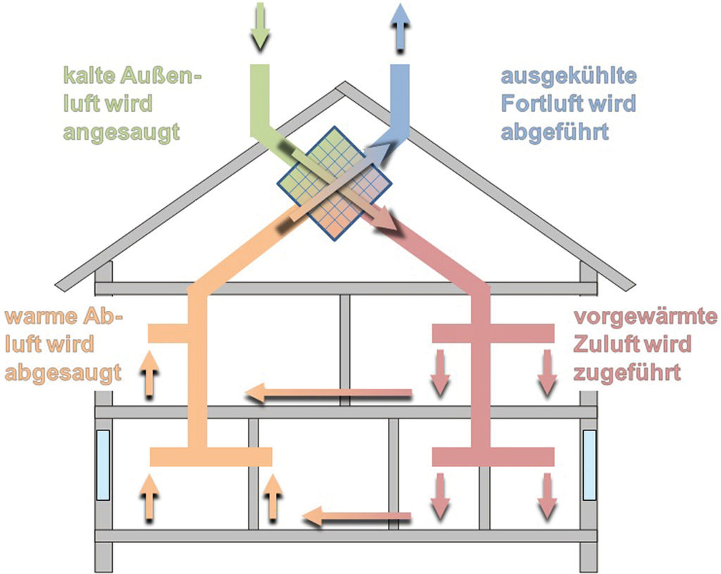 Demgegenüber sind Zu- und Abluftsysteme mit Wärmerückgewinnung so konzipiert, dass Außenluft zentral von außen angesaugt wird. Diese strömt zunächst durch Filter und anschließend über einen Wärmeübertrager in der Regel ein effizienter Kreuzstromwärmeübertrager und wird durch die abströmende Abluft erwärmt. Die so gewonnene vorgewärmte Frischluft strömt als Zuluft den Aufenthaltsräumen zu. Durch Überströmen im Gebäude gelangt sie in die Ablufträume. Dort erfolgt das Absaugen bevor die Luft das Gebäude als Fortluft verlässt, wird der Wärmeaustausch realisiert. Das bedeutet, dass das Gebäude ausreichend gelüftet wird und die Wärme mit einer hohen Effizienz im Gebäude verbleibt (Bild 2).