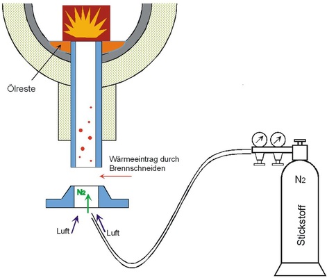 Hier bestand die Notwendigkeit, einen NH 3 -Pumpenanschluss am NH 3 -Abscheidesammler zu verändern. Der Sammler wurde von NH 3 entleert und entölt. Nicht erkennbar war, dass im Abscheider wegen des eintauchenden Abgangsrohres Ölreste mit gelöstem NH 3 verblieben waren. Dann wurde an dem abzutrennenden Flansch mit Brennschneiden begonnen, wobei vorher Schutzgas an der Brennstelle vorbei eingeleitet wurde. Durch die Ejektorwirkung am Flanscheintritt ist auch Luft in den Abscheider eingedrungen und es gelangten außerdem Schweißfunken mit hinein. Ergebnis: Ein zündfähiges Gemisch aus NH 3 , Öl, Luft und N 2 verpuffte. Brandgase schossen aus dem Rohr heraus und entzündeten alles Brennbare in der Umgebung. Der Maschinist betätigte den Notschalter. Die Folge war, dass die Löschwasserpumpen im ersten Moment kein Wasser lieferten. Die Brandbekämpfung konnte also erst verzögert einsetzen. Die gesamten Wärmedämmungen der kalten Anlagenteile verbrannten, die große Hitzeentwicklung zerstörte weitere Anlagenabschnitte.