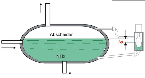 Durch offensichtliche Überfüllung der An-lage mit Kältemittel reagierte häufig der Niveauwächter und schaltete den zugehörenden Verdichter ab. Um das wiederholte Abschalten/Absaugen/Wiederanfahren zu vermeiden, wurde das obere Kommunikationsventil zwischen Niveauwächter und Abscheider gedrosselt und so die Schutzfunktion träge gemacht. Ergebnis: Infolge des Wärmeeinfalls aus der Umgebung verdampfte ein Teil des NH 3 im Gehäuse des Niveauwächters, durch die Drosselung konnte jedoch der Dampf nicht so schnell abströmen und es entstand ein höherer Druck als im Abscheider, wodurch sich eine Niveaudifferenz Δx einstellte. Das wiederum hatte zur Folge, dass das maximal zulässige Niveau im Abscheider, das Gefahrenniveau, überschritten wurde. Die Saugdämpfe rissen Flüssigkeitsanteile mit und es kam zu intensiven Flüssigkeitsschlägen an den Verdichtern, worauf 2 Zylinderdeckel von Verdichtern barsten und durch das Maschinenhaus flogen. Zum Glück blieb es beim materiellen Schaden.