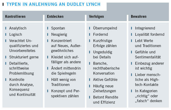 Der Verhaltensforscher Dudley Lynch identifizierte Anfang der 1990er Jahre vier unterschiedliche menschliche Verhaltensstile, basierend auf neuen Erkenntnissen aus der Gehirnforschung und der Biologie. Er zeigte auch auf, wie das Muster anhand von Eigenschaften und des Verhaltens erkannt und zugeordnet werden kann. Die tabellarische Übersicht soll Ihnen die Identifikation erleichtern.