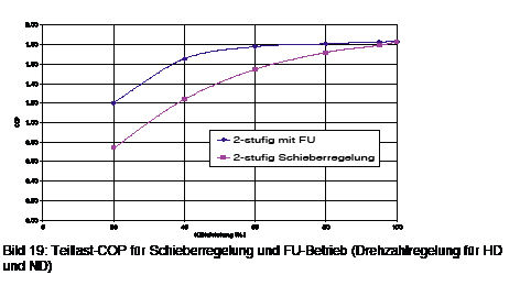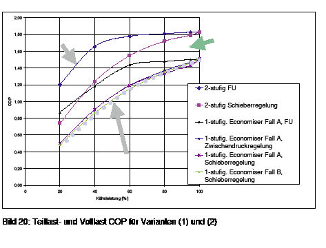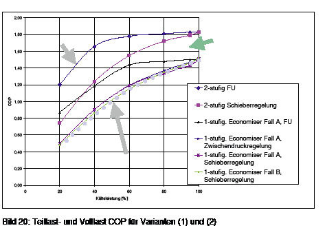 Der Teillastwirkungsgrad zweistufiger Schraubenverdichteraggregate ist trotz Schieberregelung zwischen 30% Kälteleistung und Volllast höher als der eines einstufigen Schraubenverdichteraggregates mit Economiser-Kopplung und Drehzahlregelung. Eine Verbesserung des Teillast-COP durch Drehzahlregelung ist auch für zweistufige Schraubenverdichteraggregate möglich.