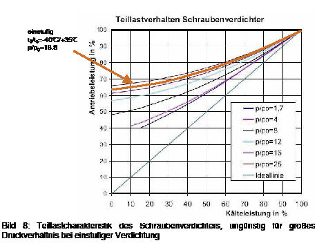 Wie in Bild 8 ersichtlich nimmt die Effizienz des Schraubenverdichters mit größer werdendem Druckverhältnis ab. Bei 50% Kälteleistung und t o /t c =40°C/+35°C (entspricht p/p o =18,8) werden etwa 75% Antriebsleistung fällig.