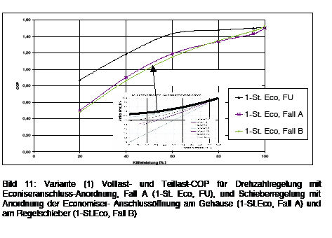 Die Anordnung der Economiseröffnung gemäß B ist aufgrund der Lage der Economiseröffnung im Regelschieber nur in einem kleinen Teillastsegment zwischen 75% und 100% Kälteleistung vorteilhafter als Fall A. Bei noch kleineren Kälteleistungen führt der Economisereffekt (bei gleicher Schieberstellung größere Kälteleistung) dazu, dass der Regelschieber noch weiter in das Teillastgebiet geschoben werden muss als ohne Economiser-Kopplung, so dass die Teillastkurve der Schieberregelung (Bild 8) dominiert. Durch die Überlagerung der ungünstigen Teillastcharakteristik beim Druckverhältnis 18,8 kann der Vorteil der Economiser-Kopplung mit Anordnung der Economiseröffnung gemäß Fall B nicht ausgeglichen werden (s. Bild 11).