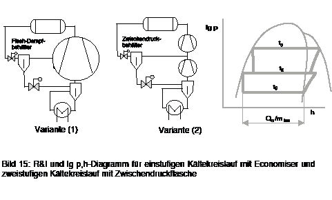 Betrachtet werden große Kälteanlagen mit Verdampfungstemperaturen unterhalb von 35°C, die entweder einstufig mit Economiser (Variante (1)) oder zweistufig (Variante (2), vgl. Bild 1) ausgeführt werden und in Kühlhäusern, in der Nahrungsmittelindustrie oder zur Prozesskühlung eingesetzt werden.