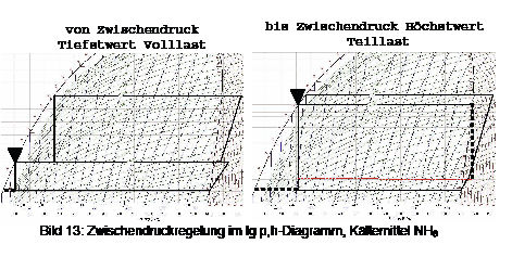 Bei Zwischendruckregelung wird der Druck im Zwischendruckbehälter ausgehend vom Bilanzzwischendruck zwecks Verkleinerung der Kälteleistung vergrößert. Dazu wird am Regelventil Vz zwischen dem Ausgang des Zwischendruckbehälters und dem Economiser-Anschluss des Verdichters gedrosselt. Der Regelschieber bleibt in Volllastposition. Durch Vergrößern oder Verkleinern der Ventilöffnung ändert sich die Kälteleistung, wie den Bildern 12 und 13 zu entnehmen ist.