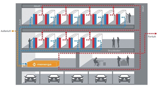 Aufgrund der großen Wärmeübertragungsfläche wird für die luftgeführte Kühlung nur ein relativ geringer Außenluftvolumenstrom benötigt. Dieser liegt bei den Anlagen des Mülheimer Lüftungs- und Klimatechnikherstellers bei maximal 60 Prozent des Umluftvolumenstromes für den Serverraum. Somit fallen auch die Abmessungen der Luftkanäle für den Außen- und Fortluftweg moderat aus, wodurch sowohl die Leitungsführung im Gebäude als auch die architektonische Einbindung in die Fassade deutlich vereinfacht werden.