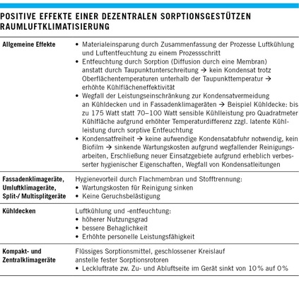 Zudem lässt sich so ein erheblicher Beitrag zur Erhöhung der Energieeffizienz gebäudetechnischer Anlagen leisten. Mit der membranbasierten Raumklimatisierung und dem indirekten flüssigen Sorptionsprozess über semipermeable Membranen (Membranelemente) könnten in Zukunft die eingangs erwähnten prozessbedingten Problemstellungen bei der Raumklimatisierung, die im Zusammenhang mit der Luftentfeuchtung (durch Taupunktunterschreitung) auftreten, ohne Leistungseinbußen oder Kompromisse zu Lasten hygienischer Anforderungen gelöst werden. -
