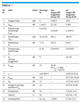 Aufgrund der Vorschaltung des Sauggas-Wärmeübertragers vor dem Eco (Bild 1) wurde von vornherein erwartet, dass der Sauggas-Wärmeübertrager den Eco stark entlastet, d. h. dass die Eco-Leistung und die Eco-Dampfmenge stark abnehmen müssen. Das konnte später rechnerisch auch nachgewiesen werden. Durch diese Entlastung des Eco stellte sich auch eine kleinere Temperaturdifferenz am Eco ein und die Temperatur der Unterkühlung t u3 hat sich erniedrigt auf