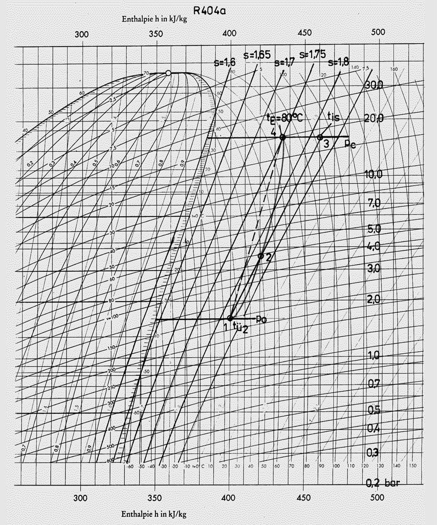 Im Bild 2 ist noch ein Bereich zwischen den Punkten 1 und 2 der roten Linie gezeichnet, in dem die Temperaturen größer sind als auf der grünen Linie, der Isentropen. Das geschieht ungewollt dadurch, dass die Öltemperatur aus dem Ölkühler mit höherer Temperatur zurückkommt, als es dem anfänglichen Temperaturverlauf bei der Verdichtung der Dämpfe entspricht. Bei der Verdichtung der Kaltdämpfe in Anlagen ohne Sauggas-Wärmeübertrager ist dieser Verlust wesentlich größer als im Bereich zwischen den Punkten 1 und 2 mit Sauggas-Wärmeübertrager. Es ergibt sich daraus aber auch ein Hinweis, das Öl noch etwas tiefer zu kühlen als bis heute üblich, wenn man mit Hochleistungs-Sauggas-Wärmeübertrager arbeitet!