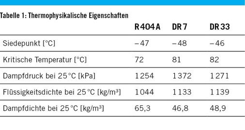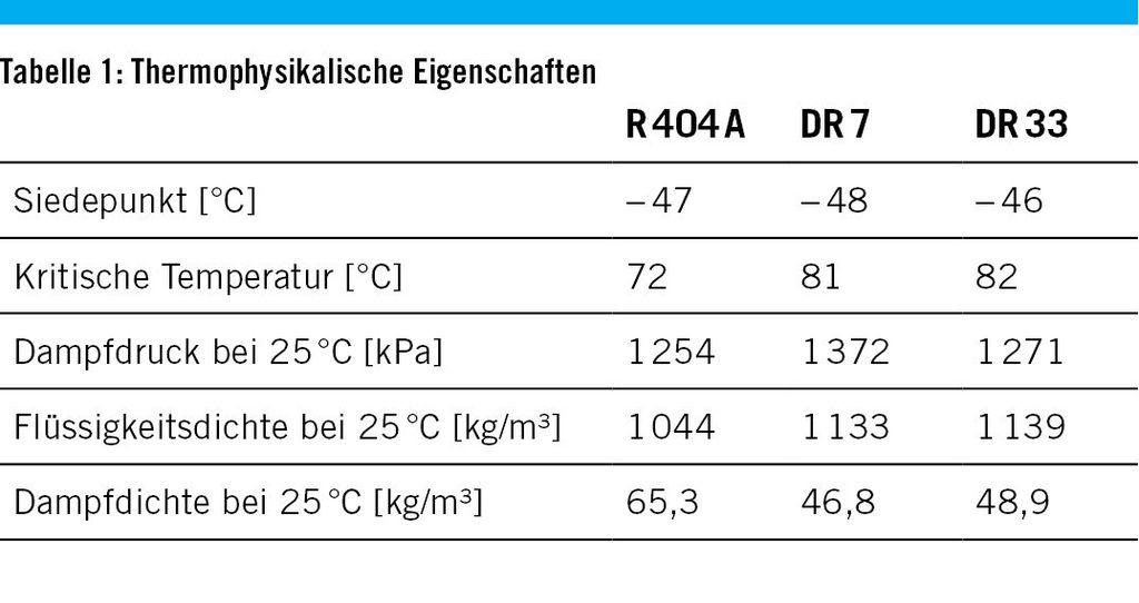 Tabelle 1 zeigt die thermophysikalischen Eigenschaften von DR 7 und DR 33 im Vergleich mit R 404 A. Alle drei Substanzen haben einen ähnlichen Siedepunkt, wobei die kritische Temperatur von DR 7 und DR 33 über der von R 404 A liegt. Dampfdrücke und Flüssigkeitsdichten sind ebenfalls vergleichbar. Die Dampfdichten von DR 7 und DR 33 liegen geringfügig unter der von R 404 A, was einen verringerten Massenstrom zur Folge hat.