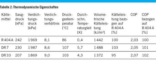 DR 7 und DR 33 weisen vergleichbare Drücke und Verdichtungsverhältnisse auf wie R 404 A. Sie haben einen höheren Temperaturgleit als R 404 A; dieser ist jedoch vergleichbar mit anderen kommerziell verfügbaren und im Einsatz befindlichen Kältemitteln. So weist das seit vielen Jahren erfolgreich eingesetzte R 407 C unter diesen Bedingungen einen Temperaturgleit von 4,8 K auf. Die Druckgastemperaturen liegen ebenfalls geringfügig über dem Wert für R 404 A, während die Kälteleistung und die Energieeffizienz nahezu identisch sind mit R 404 A.