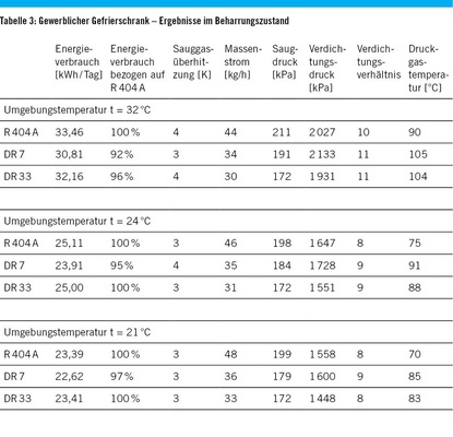 Die Tests wurden bei drei verschiedenen Umgebungstemperaturen durchgeführt: 32 °C wie von der Norm vorgesehen sowie zusätzlich bei 24 °C und 21 °C. Zunächst wurden die Referenzwerte für R 404 A bei drei verschiedenen Umgebungstemperaturen ermittelt. Die Überhitzung am Verdampferaustritt wurde mithilfe des TXV jeweils auf 3 bis 4 K eingestellt. Die Überhitzung wurde anhand des Saugdrucks und der am Verdampferaustritt gemessenen Temperatur berechnet. Die durchschnittliche Innentemperatur des Tiefkühlschranks (Durchschnittswert von vier Thermoelementen, die im Innenraum verteilt sind) wurde konstant bei 17 °C gehalten. Um die Solltemperatur im Innenraum zu halten, durfte sich der Verdichter ein- und ausschalten. Die Temperaturen und Drücke wurden nur abgelesen und dann gemittelt, wenn der Kompressor lief. Nach diesem Test wurde R 404 A zunächst durch DR 7, dann durch DR 33 ersetzt. Dazu wurde das System lediglich gespült, um das Schmiermittel zu entfernen und anschließend mit POE-Schmiermittel desselben Typs wieder aufzufüllen. Weitere Veränderungen am System wurden nicht vorgenommen. Lediglich die Überhitzung am Verdampferaustritt wurde mithilfe der TXV so eingestellt, dass die Werte von R 404 A erreicht wurden. Für beide Kandidaten wurden die TXV um eine Umdrehung zugedreht. Tabelle 3 fasst die Testergebnisse im Beharrungszustand zusammen.