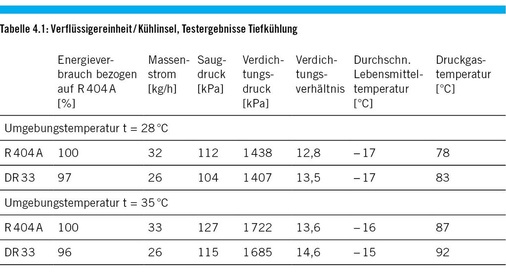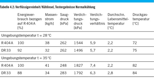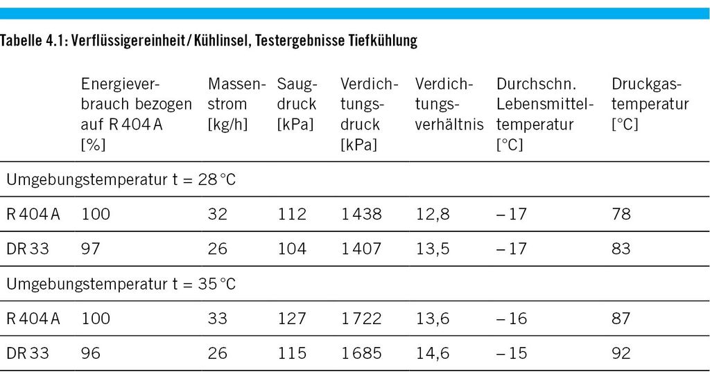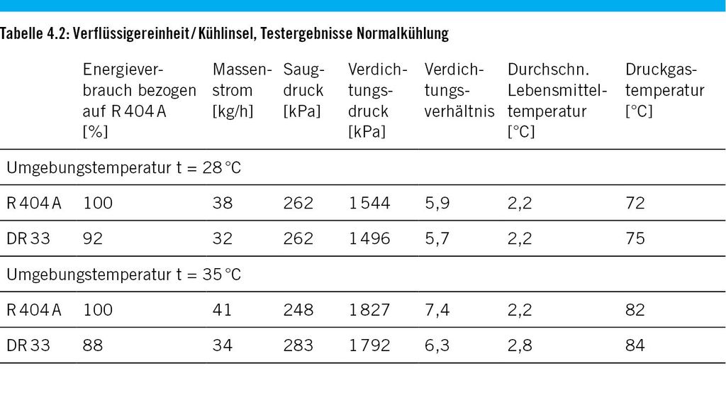 Die Testergebnisse für die Tiefkühlinsel mit Verflüssigereinheit haben ergeben, dass DR 33 ähnliche Leistungseigenschaften wie R 404 A hat, sowohl unter Tiefkühl- als auch Normalkühlbedingungen. Vor allem bei höheren Außentemperaturen ermöglicht DR 33 eine verbesserte Energieeffizienz. So lag der Energieverbrauch mit DR 33 bei Tiefkühlung um 3 bis 4 Prozent niedriger, bei Normalkühlung um 8 bis 12 Prozent. Der Saugdruck war in beiden Fällen mit R 404 A identisch, während der Verdichtungsdruck jeweils unter den Werten für R 404 A lag. Der Massenstrom war geringfügig kleiner, die Druckgastemperatur geringfügig höher. Dennoch lagen die Druckgastemperaturen für DR 33 noch unter einem Wert von 125 °C, oberhalb dessen üblicherweise eine Flüssigkeitseinspritzung erforderlich ist. Die Überhitzung am Verdampfer und die Verdichtung waren ebenfalls vergleichbar mit R 404 A.