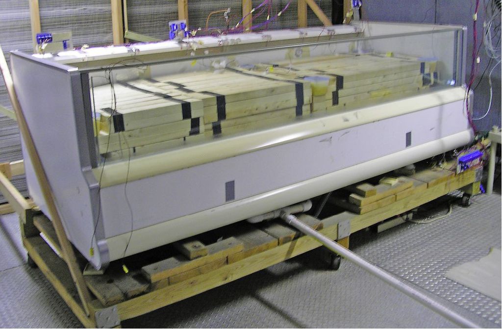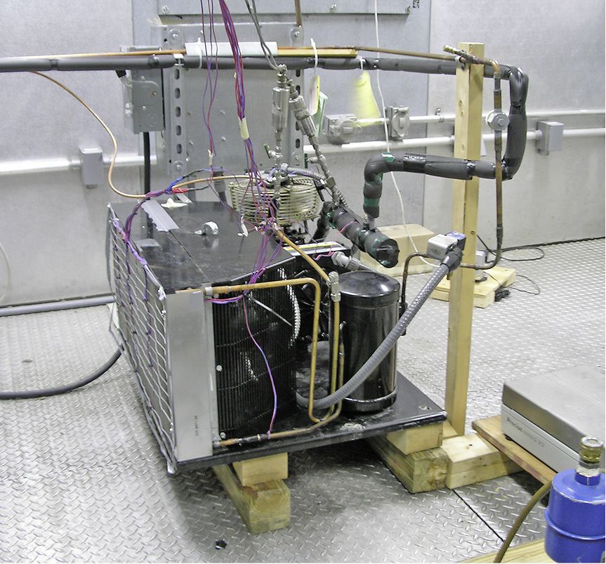 Um die Leistungseigenschaften von DR 7 und DR 33 in einem Kältesystem zu bestimmen, wurde ein für R 404 A ausgelegter zweitüriger, 1,5 m³ fassender Tiefkühlschrank (Bild 1) ausgewählt, mit Messvorrichtungen versehen und in einem konstant temperierten Raum platziert. Die Kältemittelfüllmenge beträgt 1,15 kg. Der Tiefkühlschrank hat einen Hubkolbenverdichter mit Polyolesteröl (POE) mit 32 cSt als Schmiermittel. Der Versuchsaufbau wurde so gewählt, dass er AHAM-Standard HRF-1-2008 (Energy and Internal Volume of Refrigerating Appliance, AHAM 2008) so nahe wie möglich kommt. Die Verwendung von ANSI/ASHRAE-Standard 72 war nicht möglich, da während des Tests ein Öffnen und Schließen der Türen nicht vorgesehen war. Der Tiefkühlschrank wird über zwei thermostatische Expansionsventile (TXV) gesteuert.