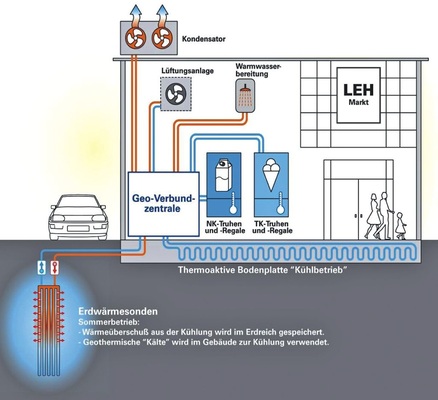Nüßle stellte dann auch in seinem Vortrag Ganzheitliche Konzepte und Betriebserfahrungen von Kälte-Wärme-Verbund-Systemen mit innovativer Speichertechnik einige Beispiele und die prinzipielle Herangehensweise vor. Dabei wird die gesamte Immobilie als energetische Einheit betrachtet. Wärmeenergie kommt solange ausschließlich aus der Kälteerzeugung, wie diese Wärme liefern kann. Als zusätzliche Energiequelle steht dann, an sehr kalten Tagen, thermische Energie aus Erdsonden oder Grundwasser (Geothermie) zur Verfügung. Der Untergrund wird im Sommer mit Abwärme aus der Kälteerzeugung thermisch aufgeladen und liefert im Winter die erforderliche Restwärme zur Gebäudeheizung. Die Speicherung von Abwärme in Gebäudebauteilen, Erdsonden und anderen innovativen Speicherträgern ist einer der Schlüssel zum Erfolg. Besondere Bedeutung hat auch das ganzheitliche MSR-Konzept, das enorme Einsparungen erwirkt. Am Beispiel eines Edeka-Marktes wies er eine Stromeinsparung von 33 684 Euro/a (= 46 %) nach.