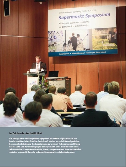 Die Referenten beschäftigten sich daher mit allen Themen rund um den Supermarkt. So ging es nicht nur um Einzelkomponenten, sondern auch um eine Betrachtung der Gebäudehülle, ganzheitliche Regelkonzepte und ein übergreifendes Monitoring. Im Rahmen dieser Berichterstattung ist es allerdings nicht möglich, auf alle Referate aus dem umfangreichen Vortragsprogramm (s. Kasten) ausführlich einzugehen, so dass wir gezwungenermaßen Schwerpunkte setzen müssen. Die Kurzfassungen aller Vorträge finden Sie jedoch im Download-Bereich auf der Homepage des ZVKKW (s. Links am Ende des Beitrags).