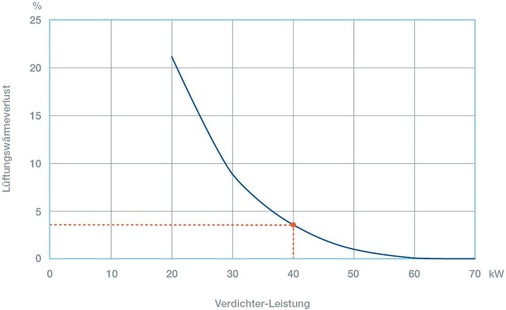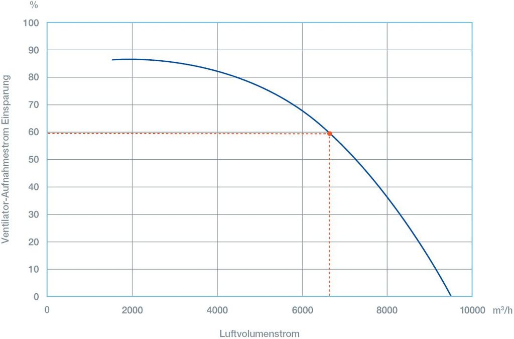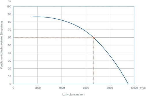 Im Vergleich der bedarfsgerechten Volumenstromreduktion mit der konstanten Betriebsweise ergeben sich über das Jahr signifikante Unterschiede bei der elektrischen Leistungsaufnahme. Nach den Berechnungen des Mülheimer Unternehmens beträgt der Energiebedarf für die Ventilatoren mit konstanter Luftleistung hier 65121 kWh/a. Demgegenüber reduziert sich dieser Verbrauch für den bedarfsgerecht geregelten Betrieb um mehr als 70 Prozent auf 18852 kWh/a. Hier zeigt sich, dass beim Einsatz von EC-Ventilatoren schon eine verhältnismäßig geringe Reduzierung der Luftleistung den Stromverbrauch erheblich verringert. Insgesamt ergibt sich aus der Energieeinsparung durch bedarfsgerechte Volumenströme eine äquivalente CO 2 Einsparung von 27,8 t/a.