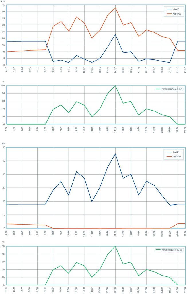 Für eine umfassende Betriebskostenanalysewurden zudem auf Basis der Daten aus dem Kloster Thuine vergleichende Simulationsrechnungen vorgenommen. Dabei wurde eine entsprechende Anlage mit ebenfalls 9500 m³/h Nennvolumenstrom für jede Betriebsstunde eines Referenzjahres durchgerechnet. Festgelegt wurde hierfür eine fiktive aber typische Personenbelegung, wie sie in Bild 5 und 6 zu sehen ist. Darauf aufbauend werden auch die Ergebnisse der Simulation der Heizleistungen von Wärmepumpe und PWW-Heizung für einen typischen Winter- und Sommertag gegenübergestellt.