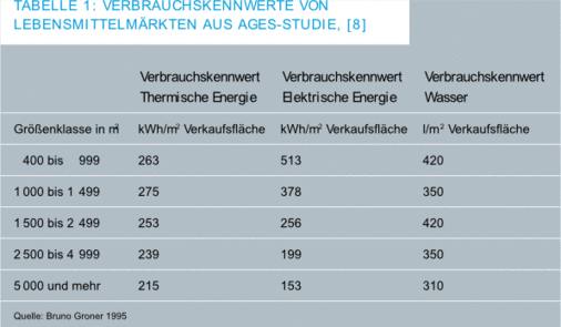 Daten für einen spezifischen Kälteverbrauch finden sich jedoch in diesen Studien nicht. Es gibt lediglich z.B. eine Rubrik zu Verkaufsstätten, bei denen im Stromverbrauch auch Kälteanlagen enthalten sind, soweit die Kälteanlagen elektrisch betrieben werden. In der AGES-Studie wird eine Tabelle aufgeführt, die Verbrauchskennwerte für thermische Energie, Strom- und Wasserverbrauch von Lebensmittelmärkten auflistet. Allerdings basieren diese Zahlen auf einer Studie des EHI Retail Institute, die bereits auf das Jahr 1994 zurückgeht. Daten für spezifische Kälteverbrauchskennwerte fehlen auch hier.