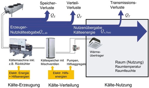 Der Energiefluss von der Kälteerzeugung über die Kälteverteilung zur Kältenutzung ist in Bild 6 dargestellt. Ausgehend von der bereitgestellten Erzeuger-Nutzkälteabgabe Q 0, Ab der Kälteanlage steht abzüglich der auftretenden Verluste (Speicherverluste, Verteilverluste) die für die Kälteanwendung nutzbare NutzKälteenergie Q 0, nutz an der Kälteübergabe zur Verfügung. Als Aufwand müssen einerseits die elektrische Energie für die Kältemaschine bzw. das Kälteaggregat als auch alle Energien für die Hilfsaggregate aufgebracht werden. Entscheidend für die energetische Bewertung der kältetechnischen Gesamtanlage ist die Festlegung der Systemgrenze zur Bilanzierung von Nutzen zu Aufwand.