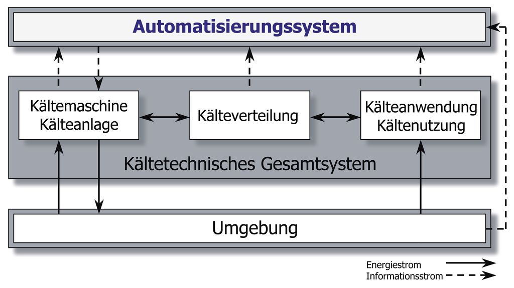 Um das Ziel eines energieeffizienten und letztendlich nachhaltigen Betriebs erreichen zu können, ist es notwendig, eine auf die konkreten Anforderungen und die spezifische Anlagentechnik optimal angepasste Automatisierungslösung umzusetzen. Aus automatisierungstechnischer Sicht ist daher eine ganzheitliche Betrachtung eines kältetechnischen Gesamtsystems, bestehend aus der Kälteanlage der Kälteverteilung und der Kältenutzung, entscheidend, wie dies in Bild 1 als Übersicht dargestellt ist.