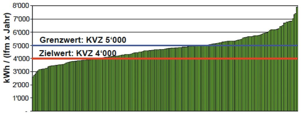 Erwähnt werden soll an dieser Stelle der in der Schweiz entwickelte Minergie-Standard für gewerbliche Kälte [9]. Hierbei wurde mit der Kältevergleichszahl (KVZ) eine Kenngröße auf Basis des elektrischen Energieverbrauchs pro laufenden Meter Kühlmöbel und Jahr festgelegt. Als Zielwert wird nach diesem Standard ein Wert von maximal 4000kWh pro laufenden Meter Kühlmöbel und Jahr vorgegeben. Bild 3 zeigt als Beispiel die Auflistung der Märkte der Migros Genossenschaften [10].