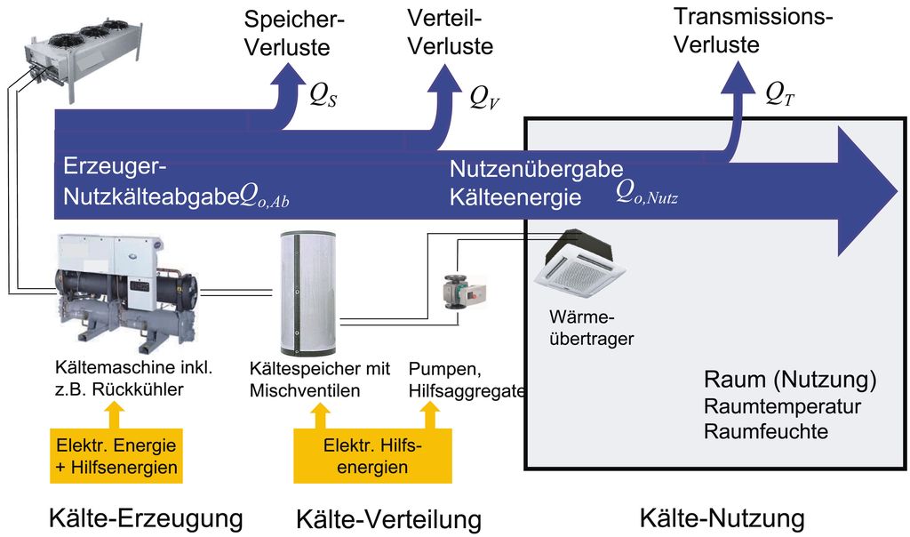 Will man nun eine energetische Bewertung von Kälteanlagen-Gesamtsystemen im laufenden Betrieb unter Berücksichtigung der Kältemaschine, der Energieverteilung (Hydraulik), der Nutzenübergabe (z.B. Wärmeaustauscher) inkl. der erforderlichen Steuer- und Regelungstechnik mit allen Hilfsenergien durchführen, ist es erforderlich, auch hierzu eine genaue Bilanzierung mit eindeutigen Systemgrenzen durchzuführen. Hierbei kann für die Teilsysteme, wie eine Kältemaschine oder eine Wärmepumpe, auf bereits eingeführte energetische Kenngrößen wie COP, EER usw. zurückgegriffen werden. Bemerkenswert ist allerdings, dass es bisher keine einheitliche Definition als gesamtenergetische Bilanzierung für das Verhältnis der einem Raum zugeführten Nutzkälteleistung bzw. -energie zu den insgesamt aufgebrachten elektrischen Leistungen bzw. Energien gibt.