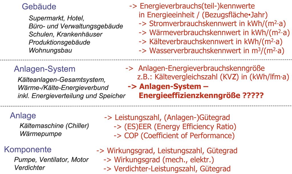 Für die energetische Bewertung von Kältemaschinen bzw. Wärmepumpen werden teilweise basierend auf verschiedenen Normen oder Richtlinien leider mehrere, zum Teil unterschiedliche, aber auch zum Teil mehrfach verwendete energetische Kenngrößen verwendet, was in der Praxis häufig zur Verwirrung und Verwechslung führt.
