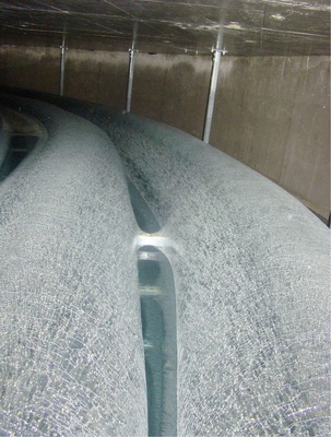 Die Solar-Luftabsorber, die die Wärmeenergie aus der Umgebungsluft und der solaren Einstrahlung aufnehmen, sind speziell für den Betrieb mit Eisspeicher und Wärmepumpe ausgelegt. Groß dimensionierte Verteiler- und Sammlerrohre ermöglichen die direkte Durchströmung mit dem Primärmedium (Solekreis) der Wärmepumpe. Mindestvolumenströme können bei geringem Druckverlust eingehalten werden. Die Absorber bestehen aus einem UV-beständigen Kunststoff und sind als Harfenabsorber konzipiert, die für eine möglichst große Oberfläche zweilagig angeordnet sind (Bild 8).