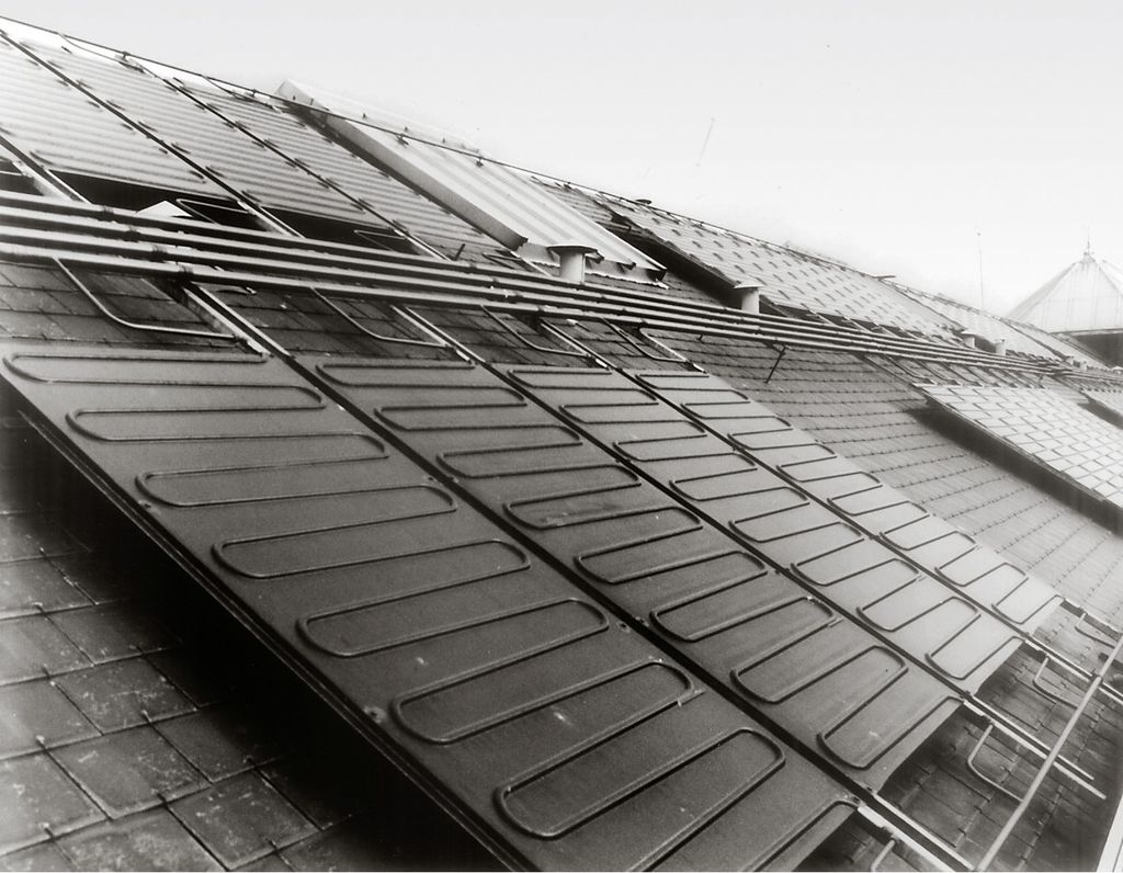 Seitdem Wärmepumpen zur Gebäudebeheizung verwendet werden, finden bei Herstellern und in Forschungsinstituten immer wieder Überlegungen statt, wie die Erschließung von Wärmequellen optimiert, die Investitionskosten reduziert und die Effizienz der Wärmepumpenanlage erhöht werden kann. Dazu gehören unter anderem Versuche, auch Sonnenenergie direkt in Wärmepumpen zu nutzen. So wurden zum Beispiel bereits Ende der 1970er Jahre des vergangenen Jahrhunderts Sole/Wasser-Wärmepumpen zusammen mit unverglasten Solarkollektoren eingesetzt, die die benötigte Naturwärme zur Verfügung stellen sollten (Bild 2). Diese Lösungen boten aber eine nicht ausreichende Effizienz und haben sich deshalb nicht durchgesetzt. Außerdem steht in Deutschland gerade während der Heizperiode, also im Winter und in der Übergangszeit, das solare Wärmeangebot nur sehr eingeschränkt bzw. in nicht ausreichendem Maße zur Verfügung.
