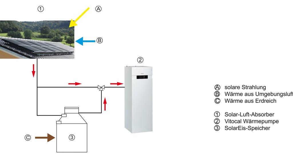 Der Fokus der Wärmegewinnung liegt bei den Solar-Luftabsorbern auf der Umgebungsluft, da diese Tag und Nacht verfügbar ist. Die solare Einstrahlung stellt eine willkommene zusätzliche Wärmequelle dar, die die Effektivität erhöht. Die unverglasten Solar-Luftabsorber sind für den Einsatz in Wärmepumpenanlagen deshalb besonders gut geeignet, da sie neben einem attraktiven Preis auch mit den vergleichsweise niedrigen Temperaturen des Solekreises problemlos funktionieren. Bei verglasten Kollektoren bestünde die Gefahr, dass sich Luftfeuchtigkeit auf den Scheiben niederschlägt und die weitere Wärmeaufnahme behindert. Daher sind herkömmliche Solarkollektoren nur bedingt für Anlagen mit SolarEis-Speichern geeignet.