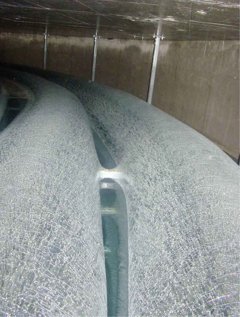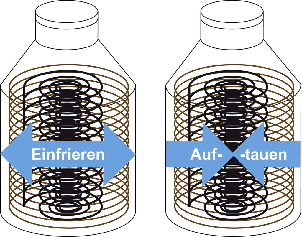 Die Eisbildung beginnt um den Entzugswärmeübertrager und setzt sich von innen nach außen fort (Bild 6). Diese Eisschicht an dem Kunststoffrohr erzeugt einen zusätzlichen Widerstand für die Wärmeleitung vom Speichermedium zum Solekreis der Wärmepumpe (Bild 7). Aufgrund der Anordnung der Wärmeübertragerrohre im Speicher geschieht die Eisbildung jedoch so, dass die Oberfläche des Wärmeübertragers dabei vergrößert wird. Diese Oberflächenvergrößerung durch das Eiswachstum und die gleichzeitige Vergrößerung des Wärmeleitwiderstandes finden in etwa proportional statt. Es wird über die größere Oberfläche mehr Wärme aufgenommen, allerdings schlechter zur Soleflüssigkeit weitergeleitet der Wärmestrom bleibt durch diesen Zusammenhang nahezu konstant.